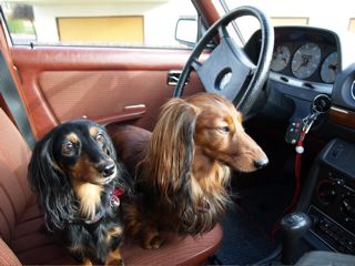 Angus und Emily sind schnell auf der Wiese unterwegs - Das Foto im Auto entstand vor dem Spaziergang!