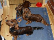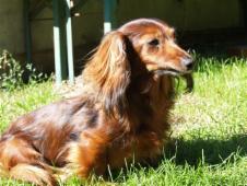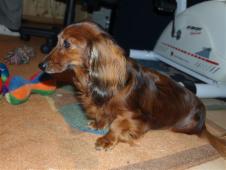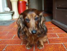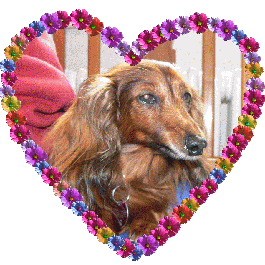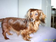 Das war im Januar 2003, kurz nach ihrem 6. Geburtstag, so hat es mir Biene erzählt. Als sie in Marienheide ankam, da gab es mich noch nicht. Abgeholt hatte sie Florian, ein roter Langhaarteckel (Standard) den sie sehr mochte. Biene war ein zitterndes Bündel. Sie konnte nicht auf glatten Böden laufen weil ihre Krallen zu lang waren. Kaum das sie umgezogen war, da musste ein Tierarzt ihr sehr viele Zähne ziehen, weil sie sehr schlecht waren und fast von selbst ausfielen. Backenzähne hat sie seither nicht mehr. Biene hat sicherlich oft Süßigkeiten naschen dürfen und ihr Lieblingsfutter war - so wurde dem Tierheim mitgeteilt – ein Katzennassfutter – Geschmacksrichtung „Wild“. Arme Biene!